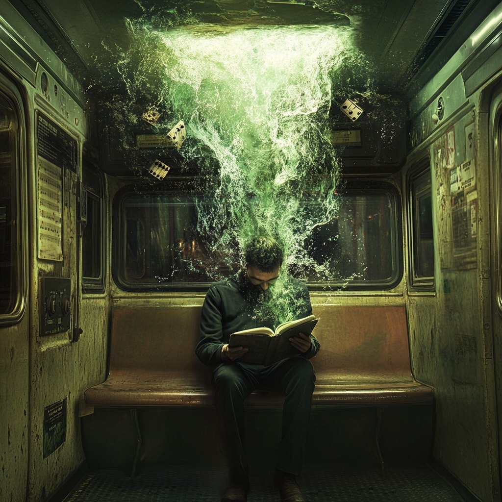 Создано на основе запроса: create a photographic image of a man sitting in a train bench trying to read an old book. the speaker above him creates a waterfall on the head of the man. the water must be green and we must see music symbols and cheap pices of meta in the water --- Автоперевод: Создайте фотографическое изображение человека, сидящего на поезде, пытающемся прочитать старую книгу. Красиво выглядит? 🤔 https://dzen.ru/id/65c0c65c86e4f837c27b24d7 #ИИ #AI #нейросеть #midjourney #art