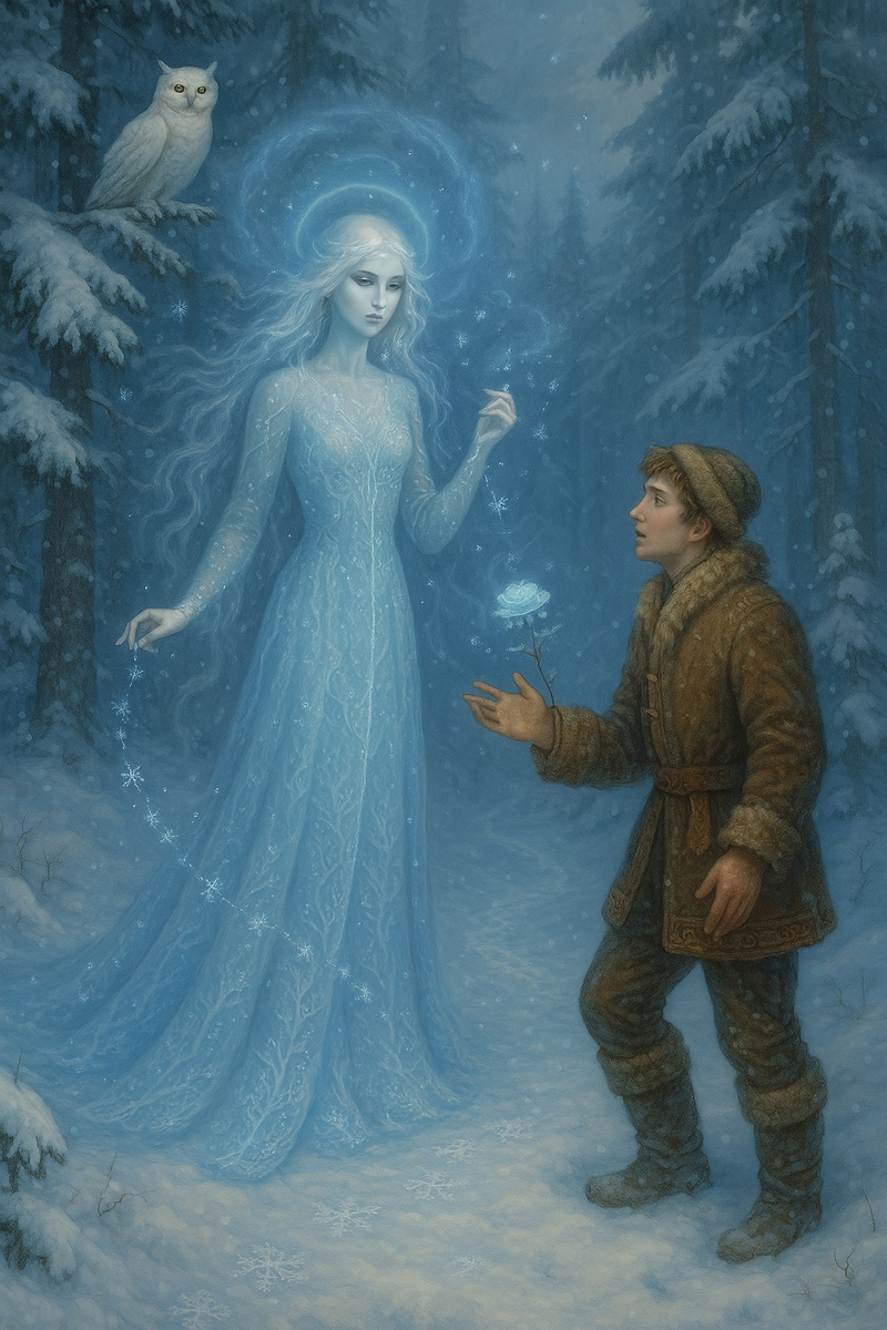 В самом сердце сибирской тайги, где деревья одеваются в снежные шубы, а северное сияние танцует по небу, жила Снежная дева. Она была дочерью самой Зимы — её волосы сверкали, как иней на ветвях, а платье было соткано из миллионов снежинок, каждая из которых имела свой неповторимый узор. Каждую ночь Снежная дева пела вьюгам, и они кружили вокруг неё, создавая новые узоры на снегу. Её голос был таким чистым, что даже волки замирали, слушая его, а звёзды начинали светить ярче. Но сердце её было холодным, как лёд, и никто не мог растопить его. Однажды в эти края забрёл юноша по имени Айан. Он охотился на оленя, но заблудился в бескрайней тайге. Услышав прекрасное пение, Айан пошёл на голос и увидел Снежную деву. Она сидела на заснеженной ветке, а вокруг неё кружили снежинки, будто танцующие духи зимы. Айан сразу понял, что никогда не видел ничего прекраснее. Каждую ночь он приходил слушать её песни, а днём оставлял у дерева подарки — ягоды, кусочки тёплого меха, даже маленькое зеркальце, чт