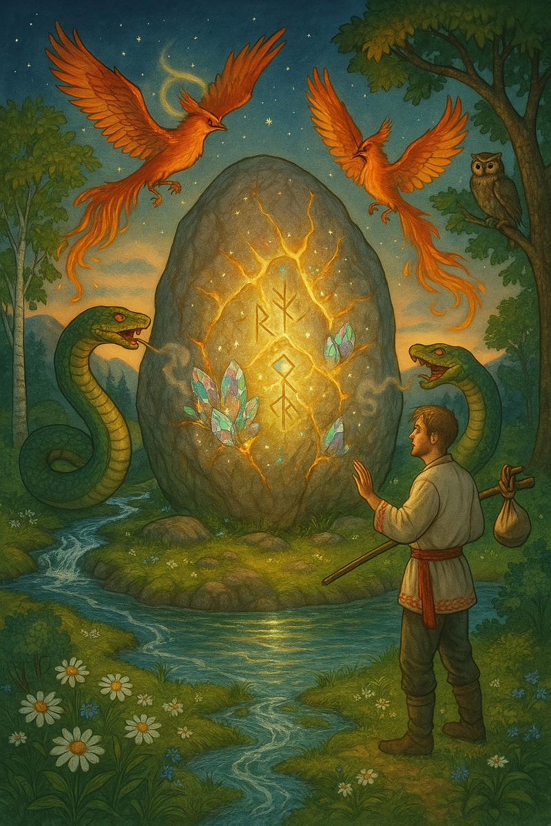 В давние времена, когда мир был молод и полон чудес, с неба упал волшебный камень Алатырь. Он был белый, как облако, и тёплый, как солнце. Где упал этот камень - там начали бить родники, из которых появились все реки на земле. Вокруг Алатыря выросло Древо Жизни, а под камнем открылся вход в подземное царство. Мудрые люди говорили, что кто найдёт Алатырь-камень, тот получит великую силу - сможет исцелять болезни, понимать язык зверей и птиц, даже разговаривать с ветром. Но найти его мог только человек с чистым сердцем, потому что змеи и волшебные птицы стерегли камень от злых людей.