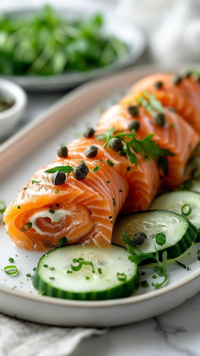Создано на основе запроса: Thin slices of cooked smoked salmon rolled with cream cheese and topped with capers, served with a side of sliced