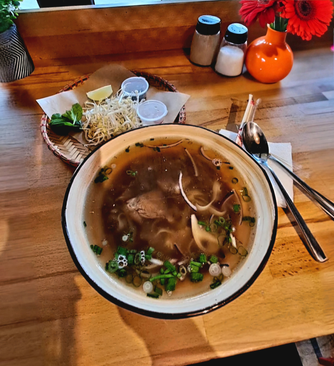 Мягкая лапша фо сочетается с нежными ломтиками говядины, вымоченными в наваристом бульоне. Свежие травы, такие как зеленый лук, кинза и базилик, придают блюду яркий вкус, а лайм и перец чили придают остроту. Каждая ложка согревает вас изнутри, делая фо согревающим атмосферой Вьетнама. 3. Уменьшите огонь до минимума, добавьте в бульон говядину и варите на медленном огне 4–5 часов. 4. Приправьте бульон рыбным соусом, попробуйте и при необходимости отрегулируйте вкус. Для аромата добавьте имбирь. 5. В отдельной кастрюле приготовьте лапшу фо, следуя инструкции на упаковке. Достаньте и разложите по сервировочным тарелкам. 6. Нарежьте говяжьи ребра или вырезку тонкими ломтиками. 7. Чтобы говядина была хорошо прожарена, слегка обжарьте ломтики.( Для приготовления блюда «фо с кровью» нарежьте говядину очень тонкими ломтиками, чтобы она быстро приготовилась, когда вы залите ее горячим бульоном). 8. Положите нарезанное мясо поверх рисовой лапши в каждую миску. 9. Залейте лапшу и мясо горячим бул