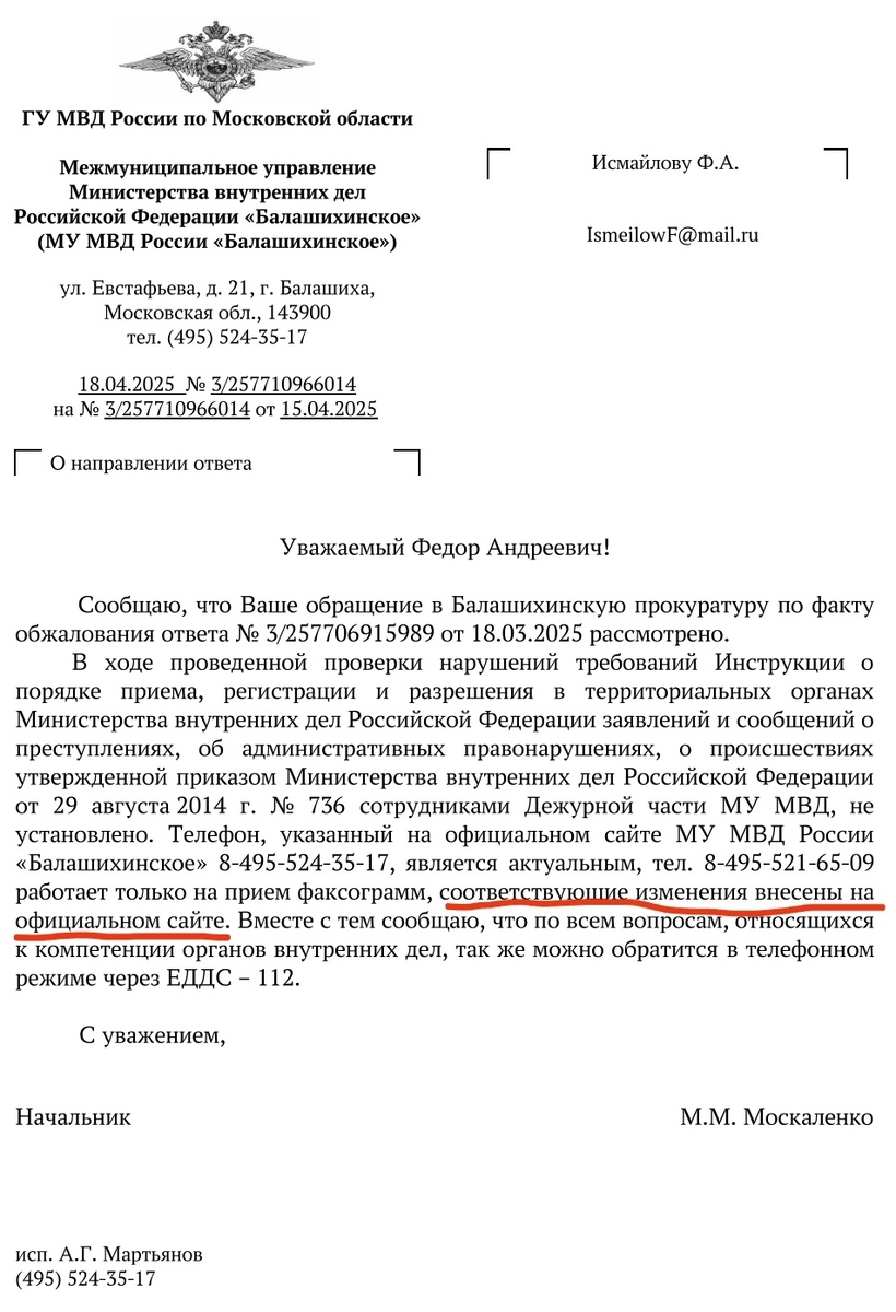 Не прошло и трёх месяцев и звонка мне из Инспекции по личному составу для уточнения обстоятельств Вопрос, почему сотрудник дежурной части МУ МВД "Балашихинское" не поднимал трубку, пока остался без ответа 🤷♂️