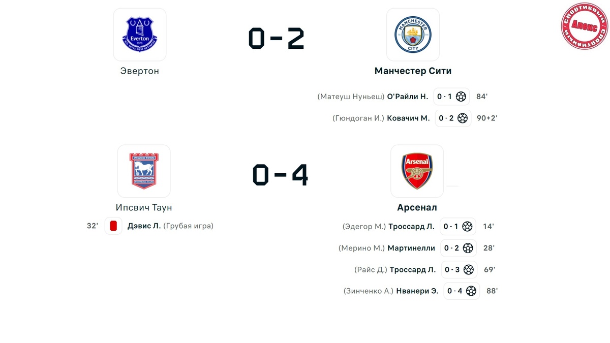 Друзья, состоялся 33 тур в английской премьер-лиге. В этом обзоре вас ждут результаты сыгранных матчей и турнирная таблица. Эвертон на своём поле принимал Манчестер Сити. «Горожане» контролировал игру, однако забили лишь в конце матча. Первый мяч удалось реализовать на 84-й минуте. О’Райли замкнул прострел Матеуша Нуньеша (1:0). В компенсированное время Матео Ковачич с передачи Гюндогана поставил точку в матче. Пикфорд был бессилен. Итог – 2:0. Манчестер возвращается в зону Лиги Чемпионов. Ипсвич принимал Арсенал. В отличие от предыдущего матча, здесь «канониры» сразу взялись за дело и к середине первой половины реализовали два момента. На 14-й отличную передачу Эдегора с близкого расстояния замкнул Леандро Троссард (1:0). Ещё через 14 минут Габриэль Мартинелли удваивает результат, ударом в упор (2:0). В первом тайме хозяева поля остались в меньшинстве. За грубость прямую красную карточку получает Лейф Дэвис. Во второй тайма Троссард в штрафной нанёс удар низом и оформил дубль. А разгр