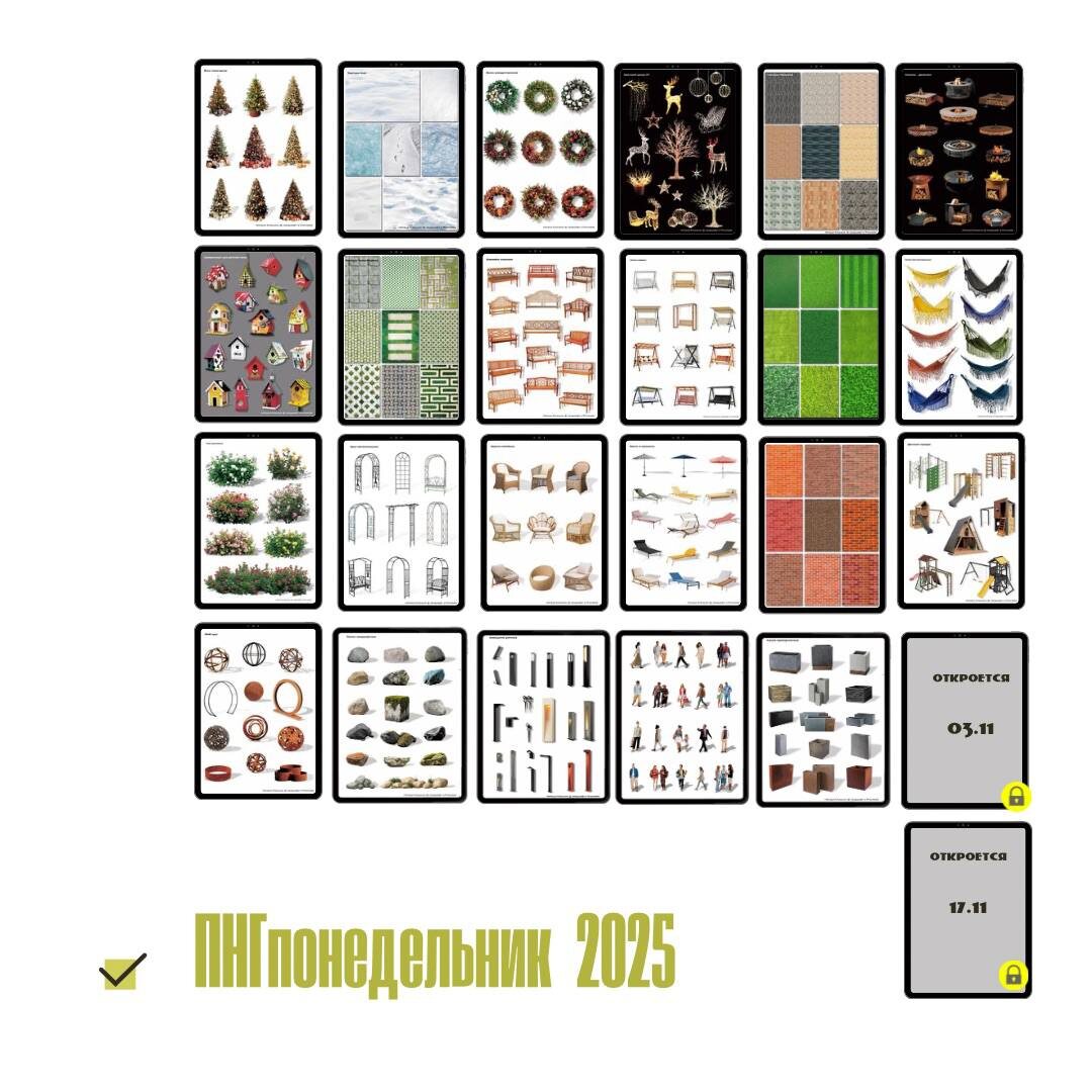 🪴Ёлки новогодние 🪴Текстура Снег 🪴Венки рождественские 🪴Световой декор 🪴Текстура Мощение 🪴Камины-дровники 🪴Скворечники для детской зоны 🪴Текстура Газон Решётка 🪴Скамейки классика 🪴Качели садовые 🪴Текстура Газон Трава 🪴Гамаки бохо бескаркасные 🪴Розы Шиповники 🪴Арки металлические 🪴Кресла плетёные 🪴Зонты и шезлонги 🪴Детский городок 🪴Текстура Кирпич 🪴МАФы круг 🪴Камни ландшафтные 🪴Освещение уличное 🪴Люди 🪴Кашпо прямоугольные 🪴Люди контурные 🪴Елки новогодние 🦞будут в продаже в марте 🙌🏻 👉🏻 все ПНГпонедельники здесь .