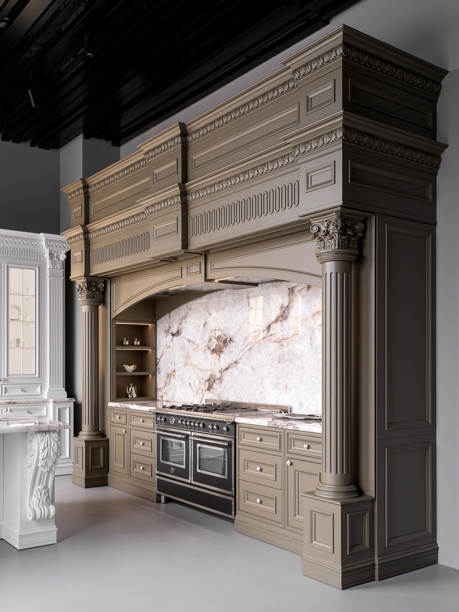 Одним из наиболее эффектных элементов нашей новой кухни в классическом стиле стал портал, высота которого достигает почти 4 метров. Благородные линии и резные детали, выполненные вручную, подчеркивают его монументальность и премиальный характер.