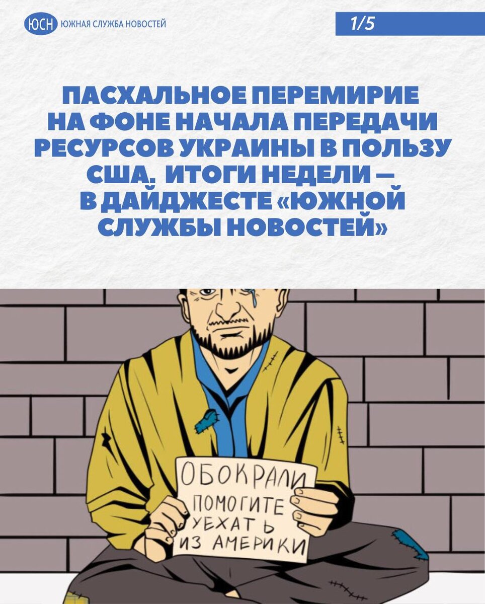 🔹 Пасхальное перемирие на фоне начала передачи ресурсов Украины в пользу США. Итоги недели – в дайджесте «Южной службы новостей» После многомесячных переговоров, которые периодически перемежались скандалами на разных уровнях взаимодействия, Украина и Штаты подписали первый документ, регламентирующий американское использование украинских ресурсов. 🌐 Южная служба новостей