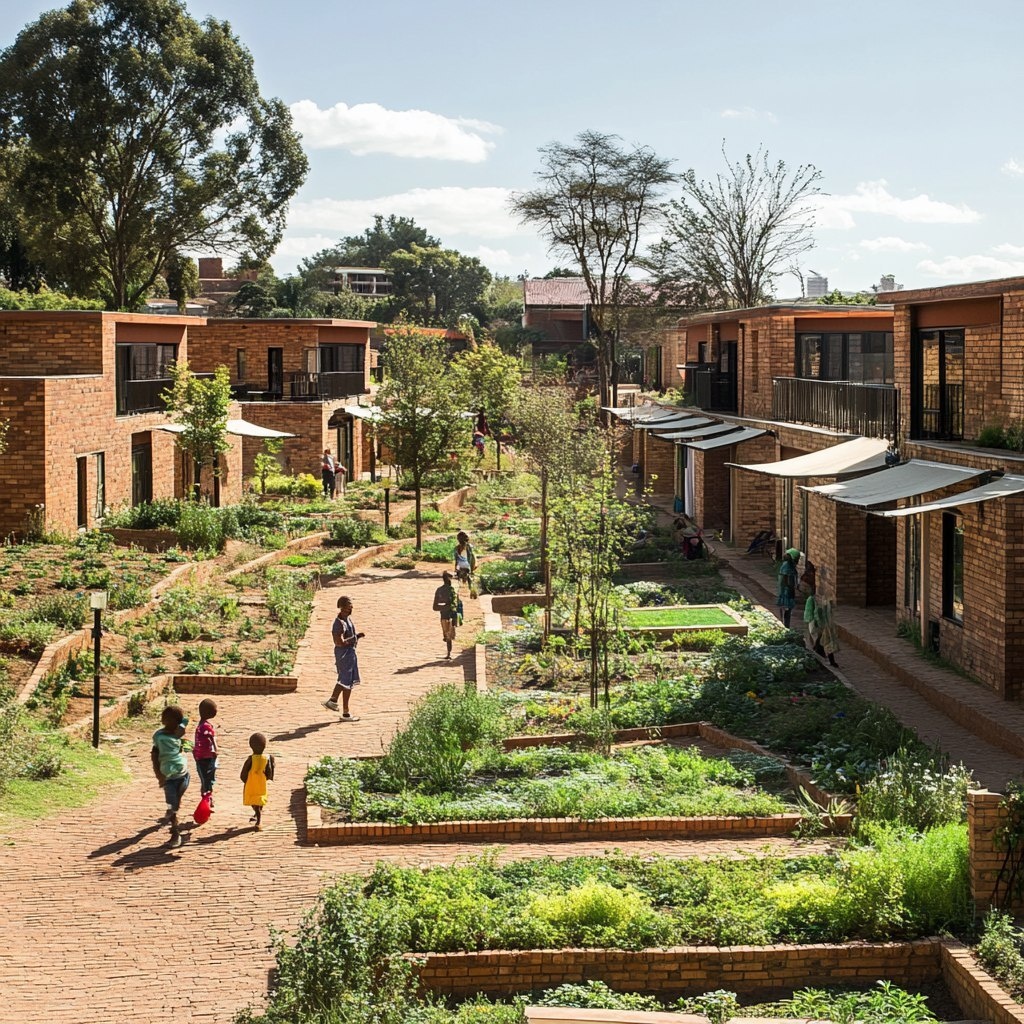 Создано на основе запроса: photojournalism-style image of a South African urban area with green roofs, shaded clay-brick buildings, rooftop