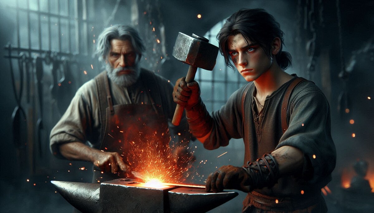 Мирослав с хрипом выдохнул, мышцы напряглись до предела. Тяжёлый кузнечный молот, казавшийся в его пятнадцатилетних руках орудием титана, с грохотом обрушился на раскалённую заготовку. Искры брызнули фонтаном, опаляя лицо юноши, отражаясь в его серых, как у отца, глазах. Воздух, насыщенный запахом гари и металла, вибрировал от ударов, словно сама кузница тяжело дышала в такт работе. Борислав коротким жестом указывал на место следующего удара. Его рука, покрытая шрамами – летописью жизни у горна, – была твёрда и точна. Казалось, он чувствовал металл, как продолжение собственного тела. Лена стояла чуть в стороне, внимательно наблюдая за процессом. Лена стояла поодаль, готовая в любой момент подать инструмент или подсказать, если что-то потребуется. Ее присутствие было полезным, даже несмотря на юный возраст – свежий взгляд и внимательность помогали Мирославу и Бориславу не упустить важные мелочи. Борислав, хоть и относился к Лене с некоторым недоверием из-за её увлечения изобретениями, все же был благодарен за помощь.