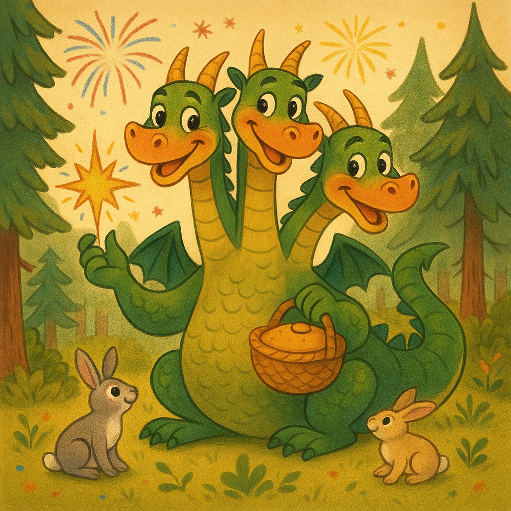 В дремучем лесу за синей горой жил Змей Горыныч. Было у него три головы, семь хвостов, а из пастей так искры сыпались, что кусты вокруг обуглились. Все звери от него прятались, птицы стороной облетали. Скучно стало Горынычу — не с кем словом перемолвиться, не над кем пошутить. Как-то раз пролетал над лесом Ворон Воронович. Увидел Змея, сидящего на камне, и спрашивает: "Что, Горыныч, нос повесил?" А тот в ответ: "Да вот, все меня боятся, а я ведь и поиграть люблю, и загадки загадывать". Задумался Ворон, потом говорит: "А ты попробуй добрым быть, может, тогда с тобой дружить станут?"