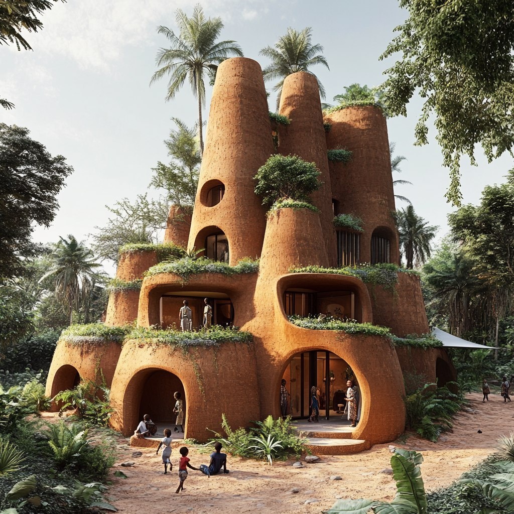 Создано на основе запроса: ultra-realistic image of a clay-structured building in West Africa with natural air circulation towers inspired by termite architecture shaded areas, green roof, internal coolness children playing outside, peaceful dry-season heat handled wisely --- Автоперевод: Ультрареалистичный образ здания, структурированного глиной, в Западной Африке с натуральными башнями для циркуляции воздуха, вдохновленными термитами архитектурой, затененные участки, зеленая крыша, внутренняя прохлада, которые дети играют на улице, мирное сухое сезон, обработанное с умом Классно получилось? 🤔 https://dzen.ru/id/65c0c65c86e4f837c27b24d7 #ИИ #AI #нейросеть #midjourney #art