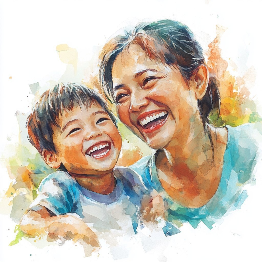 Создано на основе запроса: soft watercolor illustration of pinay mother and son laughing together, no background