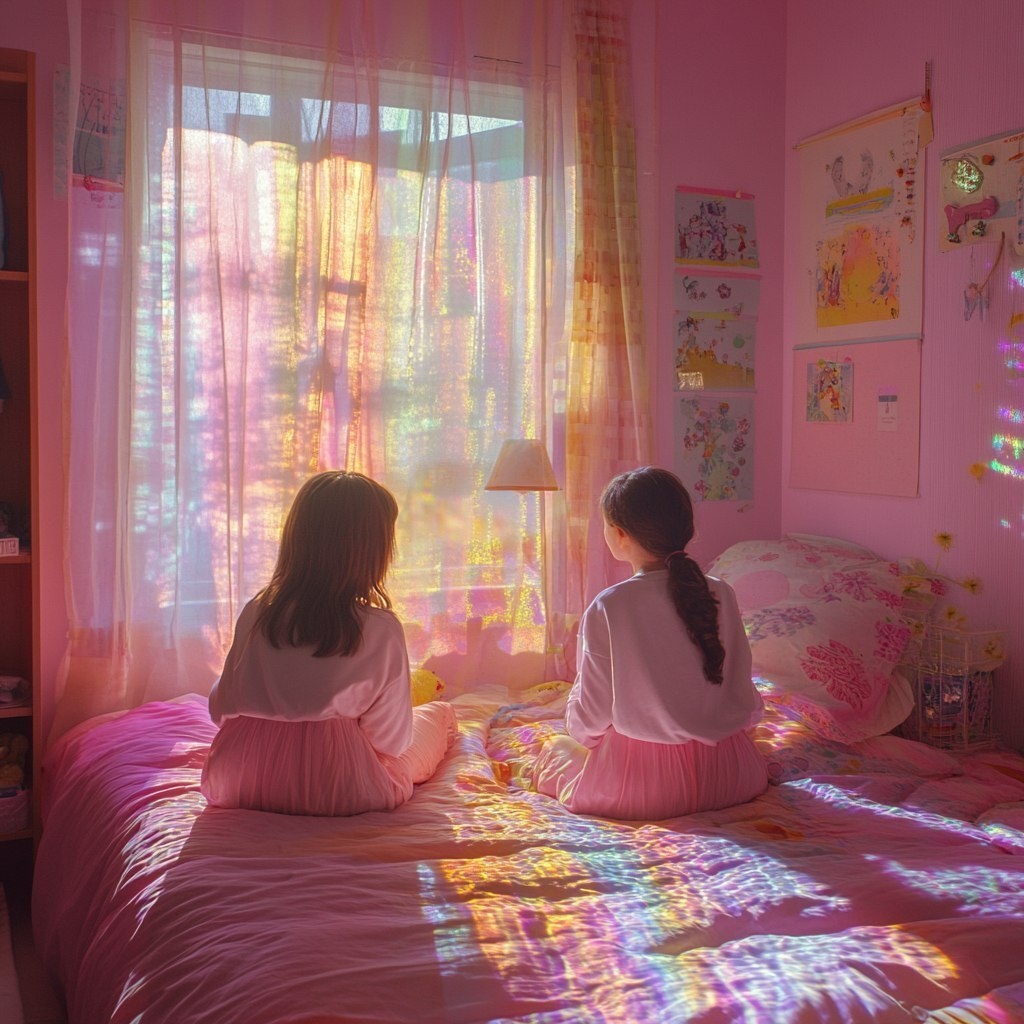 Создано на основе запроса: a sleep room for 2 girl sisters, pink and fun everything is reflecting and there are intricate old objects