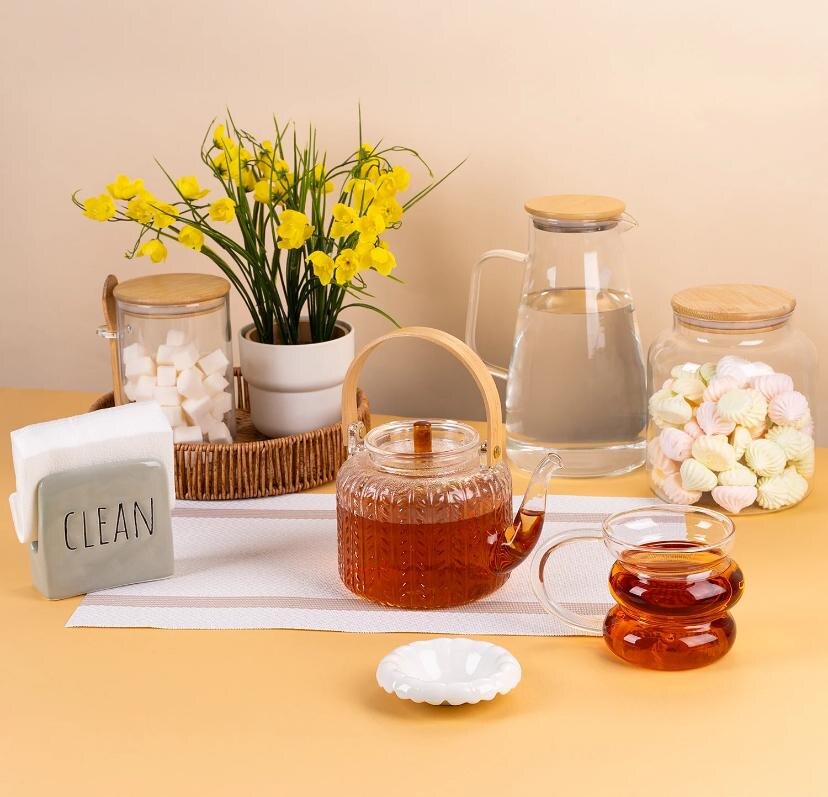 Новый стеклянный чайник с деревянной ручкой просто восхителен. У него вязаная фактура. Смотрится шикарно. Не удержалась, купила в городскую квартиру. Объем 1,05 л.