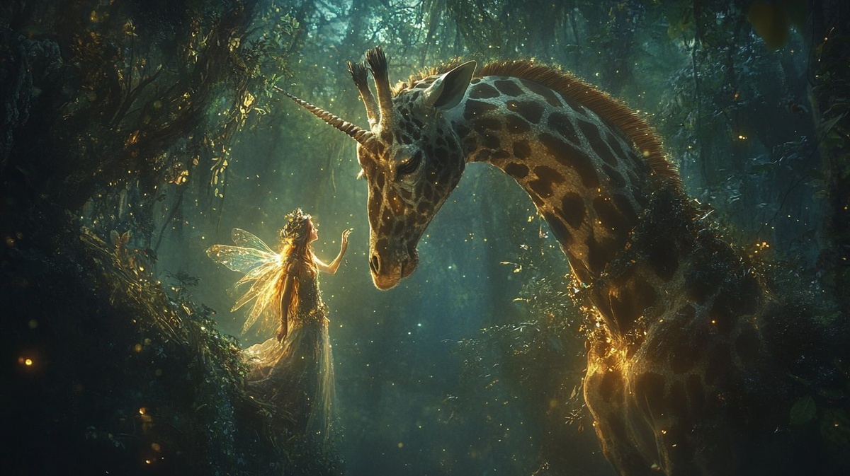 Автоперевод: Фэнтезийная сцена феи и гирафского гибрида единорога в зачарованном лесу.