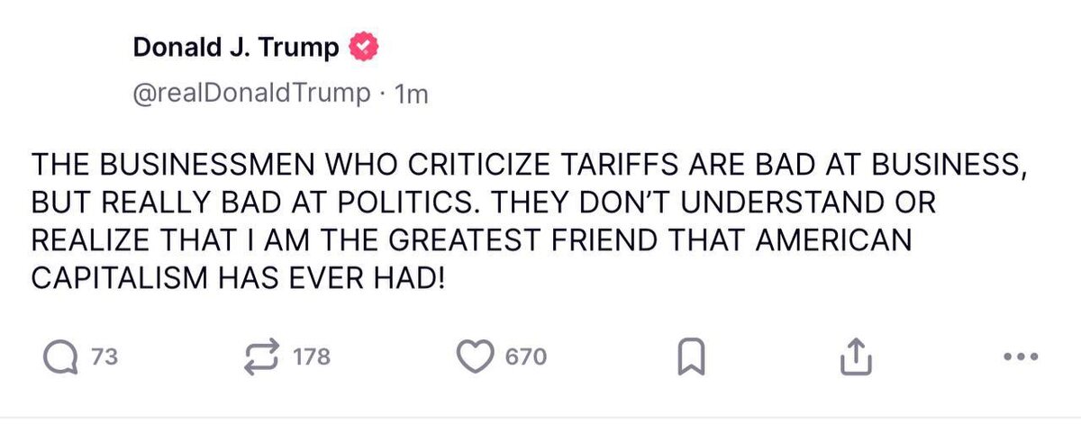 В ответ на пост Trump calls himself ‘GREATEST FRIEND’ American capitalism’s ‘EVER HAD’ Blasts businessmen ‘bad at business’ whining about tariffs: ‘really bad at politics’ Agree with him?