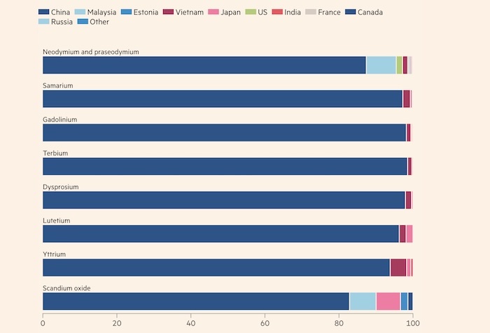 Трейдеры и руководители компаний предупреждают: запасов мало, на производство автомобилей может не хватить Кто добывает редкие минералы (доли в процентах). Источник: The Financial Times Китай заявил, что будет контролировать экспорт редкоземельных минералов, и если он полностью перекроет поставки, запасы магнитов, необходимых для производства автомобилей, закончатся через несколько месяцев. Пекин расширил экспортные ограничения на семь редкоземельных элементов и магнитов, жизненно важных для электромобилей, ветряных турбин и истребителей. Решение было принято в начале апреля, после того как президент США ввел для Китая тарифы в размере 145%. Правительственные чиновники, трейдеры и руководители автомобильной промышленности заявили, что при запасах, которых, по оценкам, хватит на срок от трех до шести месяцев, компании будут спешить накапливать больше материала и искать альтернативные поставки, чтобы избежать серьезных сбоев. Ян Гизе, трейдер металлов из франкфуртской компании Tradium, п