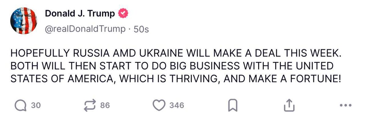 В ответ на пост ❗️Trump hints at Russia-Ukraine deal ‘THIS WEEK’ ‘BIG BUSINESS’ with US on the table right after agreement This is Trump’s 5th Truth post in 20 minutes