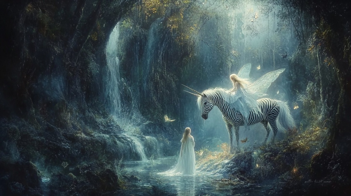 Создано на основе запроса: a fantasy scene of a fairy and a Zebra coat unicorn in an enchanted forest