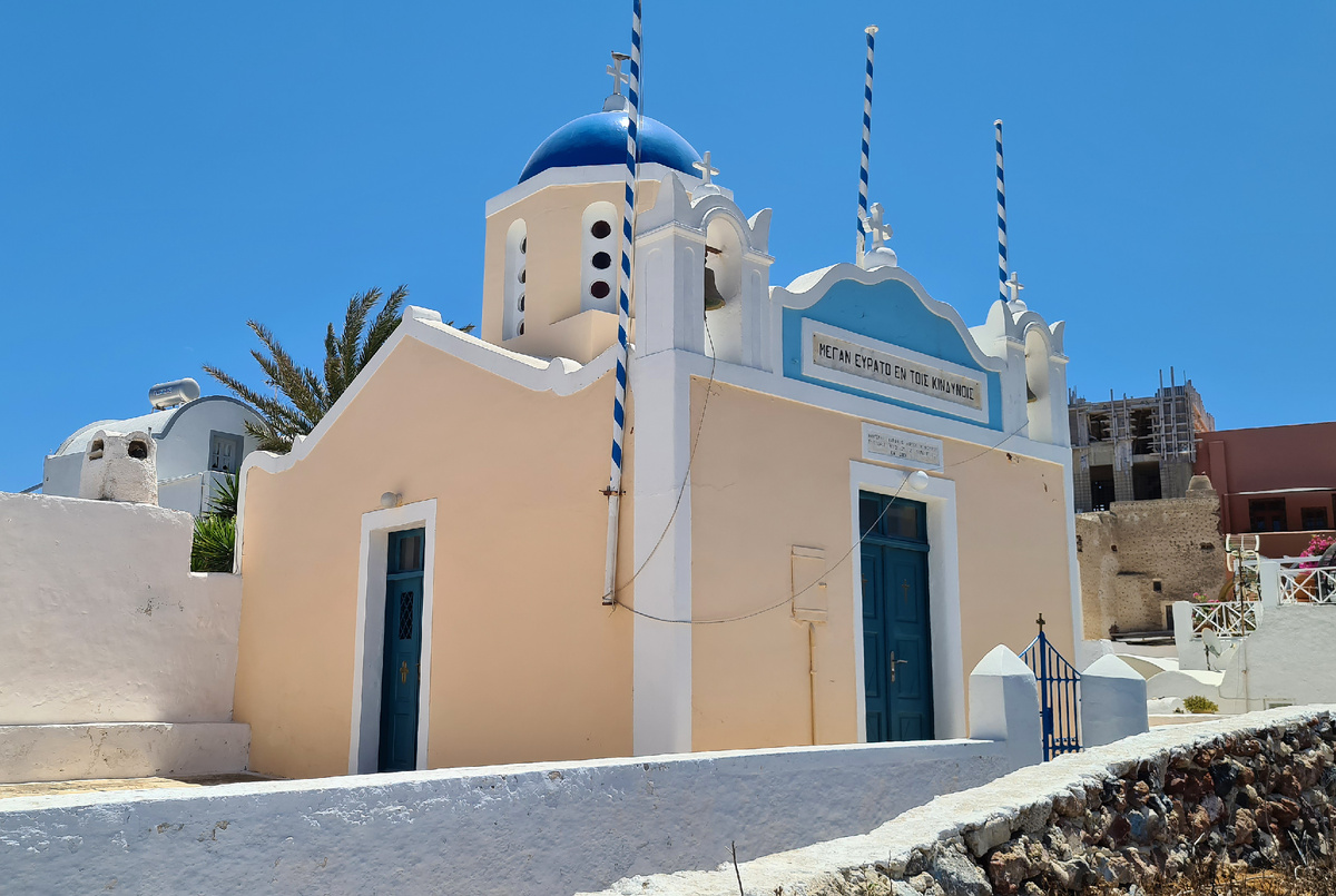 В Трипадвайзоре главной достопримечательностью в Санторини с рейтингом 1 является пешеходный маршрут «Ия — Фира». Мы в семье любим пешеходные маршруты и, возможно, в этот день, забыв про всё остальное, отправились бы на ногах в Фиру. В конце концов, что такое для нас 11 километров? Но уже с вечера у меня возникли серьезные сомнения. Дорога проходит по верху безжизненной красной скалы. Да, виды на кальдеру должны быть замечательными. Но те же самые замечательные виды предлагает наша терраса на вилле. В общем, не поверив Трипадвайзору, мы просто прогулялись по Ие. Посмотрели на церковь абрикосового цвета. Абрикосовый цвет — редкость: обычно церкви здесь белые с синими крышами.