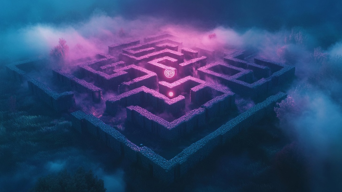Создано на основе запроса: A retro cinematic top-down shot of a massive, stone-built maze with deep walls and complex geometric paths, clearly visible from above, placed in the middle of a glowing misty field at night. The maze is surrounded by soft, swaying grass and dreamy neon fog, inspired by 1980s color grading with deep blue and purple tones. Faint glowing symbols like a rose and an illustrated eye appear in the surrounding mist and clouds. VHS tape texture, heavy film grain, melancholic and surreal atmosphere, nostalgic visual tone