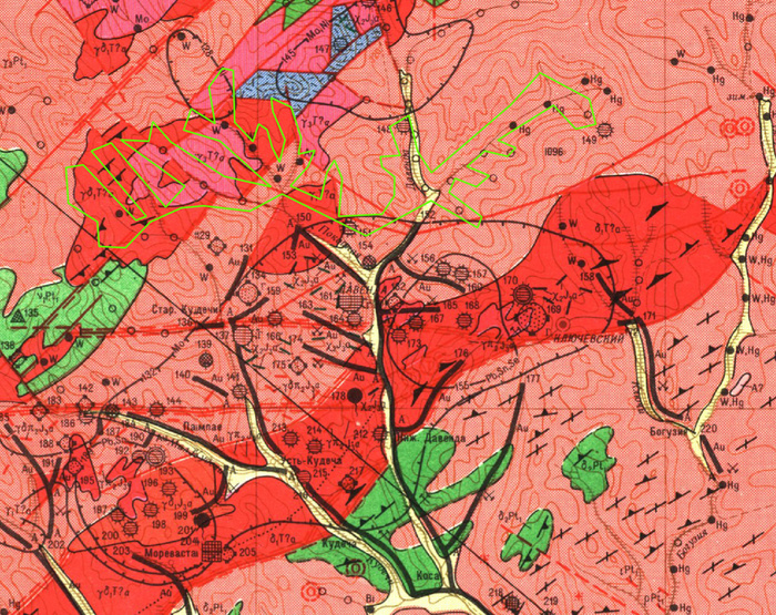 С точки зрения геологии ситуация аналогичная: граниты-гранодиориты, только добавляется гнейсово-сланцевый комплекс с линзами мраморизованных известняков и кварцитов. Обращают на себя внимание на 2 потока рассеяния золота на севере.