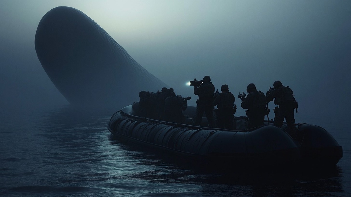 Создано на основе запроса: A group of armed soldiers in tactical gear on a black military boat at dawn, surrounding a massive, smooth, black