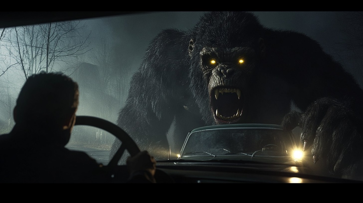 Создано на основе запроса: A terrified man sits inside a car at night, gripping the steering wheel, his eyes wide in shock. The car's headlights illuminate a massive, ape-like creature emerging from the darkness in front of an old, abandoned barn. The beast is over 3 meters tall, covered in thick, dark fur, with glowing yellow eyes reflecting the light. It lets out a powerful roar, its mouth open wide, creating a shockwave that shakes the car’s windshield. The scene is set in a lonely forest road near a military base, with fog and tall trees in the background. The atmosphere is tense, mysterious, and eerie designed to evoke fear and curiosity. Make the creature and the man inside the car the central focus. Hyper-realistic style, cinematic lighting, dramatic composition. --- Автоперевод: Ночью в ужасе сидит в машине, сжимая руль, его глаза широко в шоке. Как тебе картинка? 🤔 https://dzen.ru/id/65c0c65c86e4f837c27b24d7 #ИИ #AI #нейросеть #midjourney #art