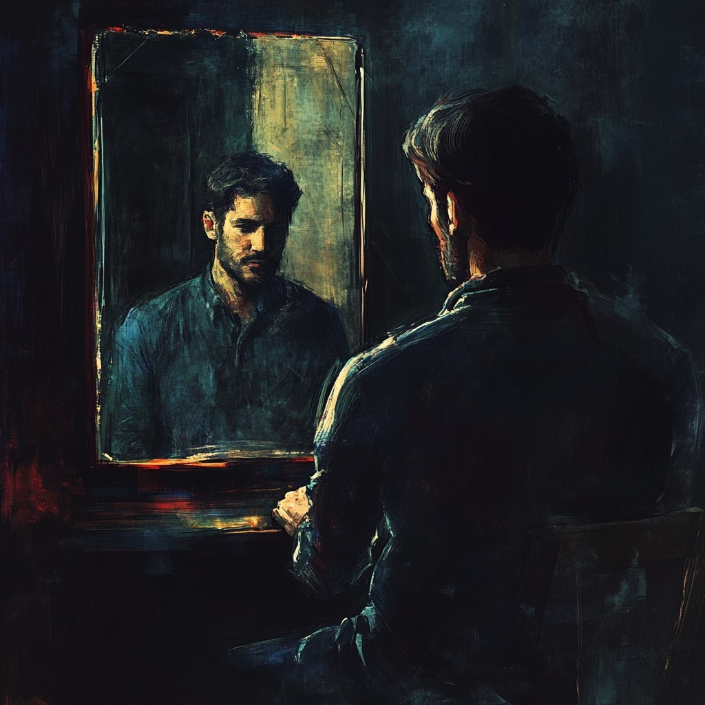 Создано на основе запроса: man character age 30, siting in front mirror and talk with his reflaction , high qulity , Alvaro Castagnet style