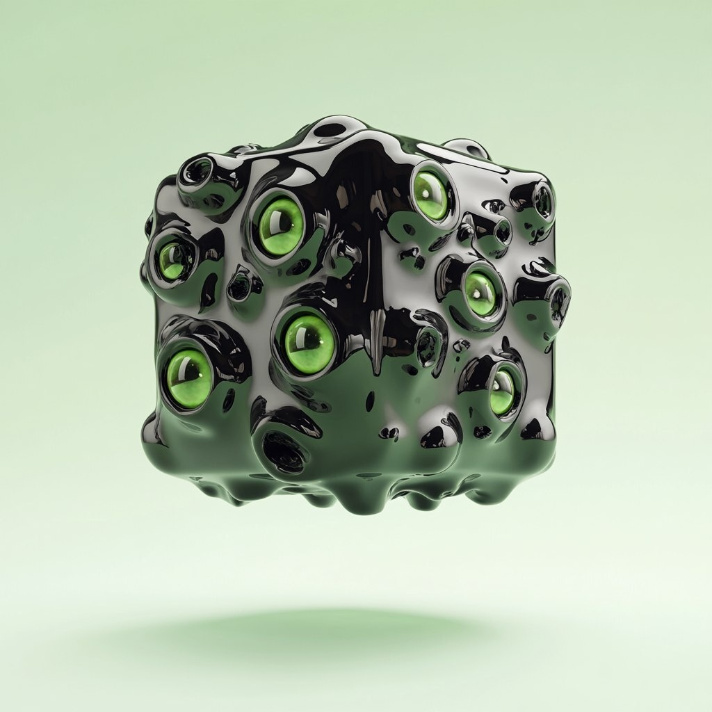 Создано на основе запроса: floating cube, green backgroun, texture resembles black oil, shiny, very small eyes with green pupils spread in