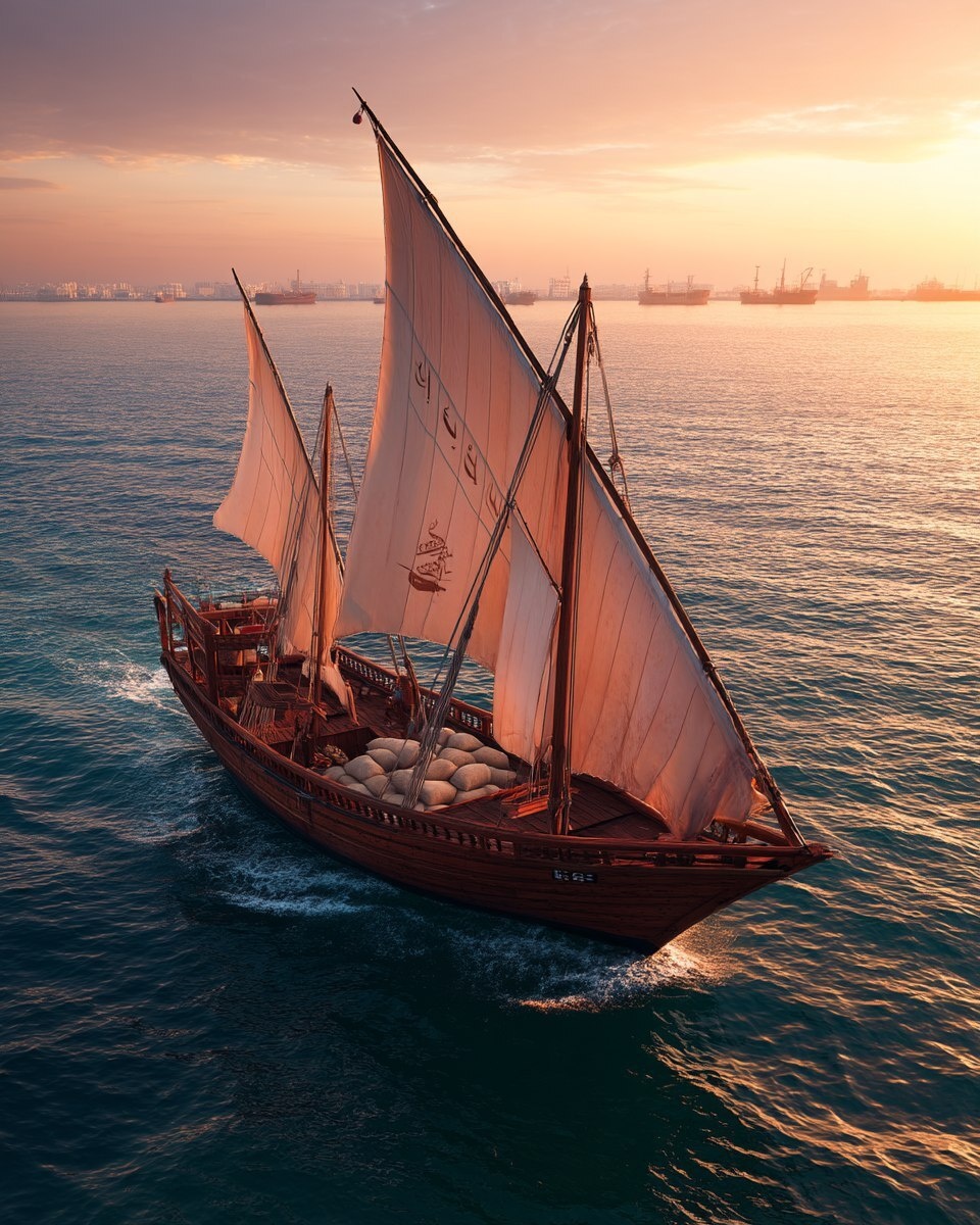 Создано на основе запроса: Photorealistic traditional wooden dhow ship with Red Sea Coast Coffee sacks onboard, sailing across the Red Sea during a golden hour sunset, dramatic lighting, distant coastal port in background, sails with subtle logo pattern, epic and cinematic atmosphere --- Автоперевод: Фотореалистическое традиционное деревянное судно с кофейными мешками на побережье Красного моря на борту, плавая через Красное море во время заката Золотого часа, драматическое освещение, отдаленный прибрежный порт на фоне, паруса с тонким схем логотипа, эпическая и кинематографическая атмосфера Необычно выглядит? 🤔 https://dzen.ru/id/65c0c65c86e4f837c27b24d7 #ИИ #AI #нейросеть #midjourney #art