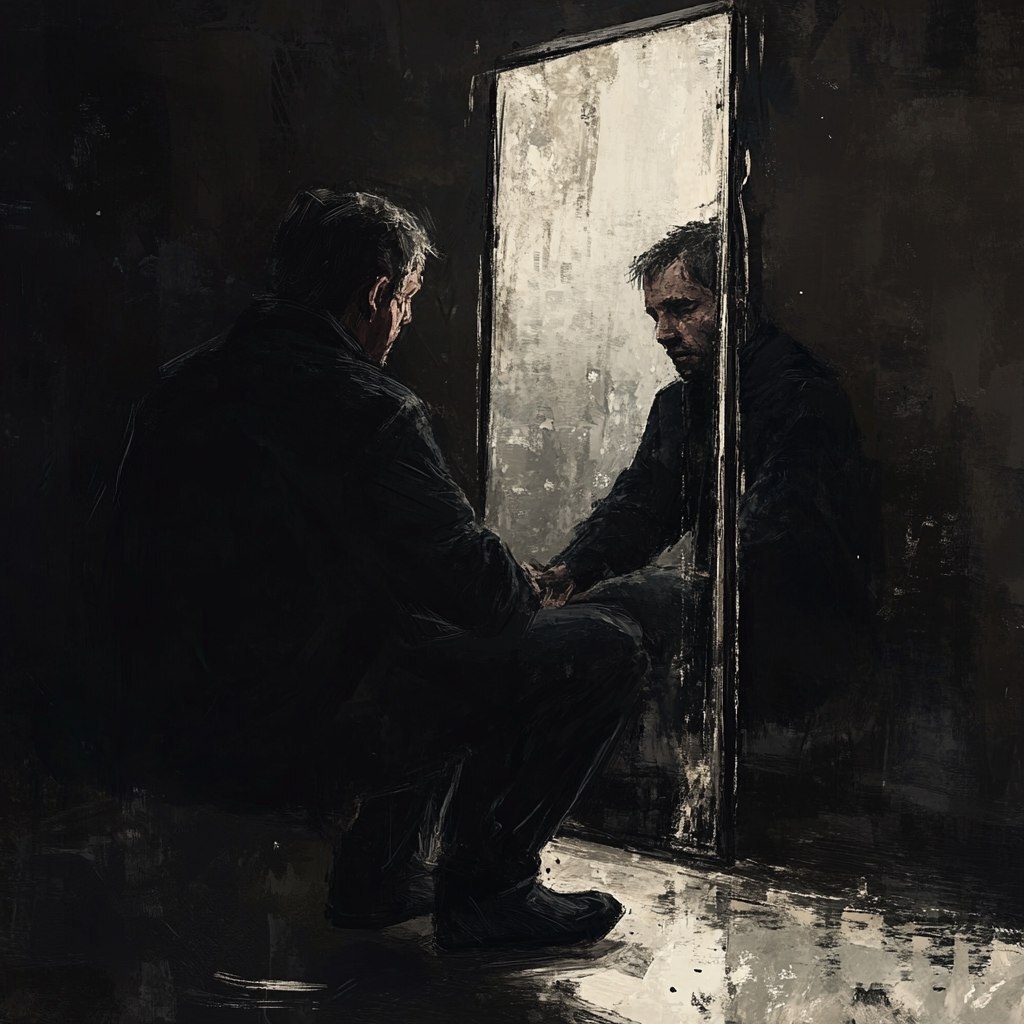 Создано на основе запроса: man character age 30, siting in front mirror and talk with his reflaction , side view picture , high qulity