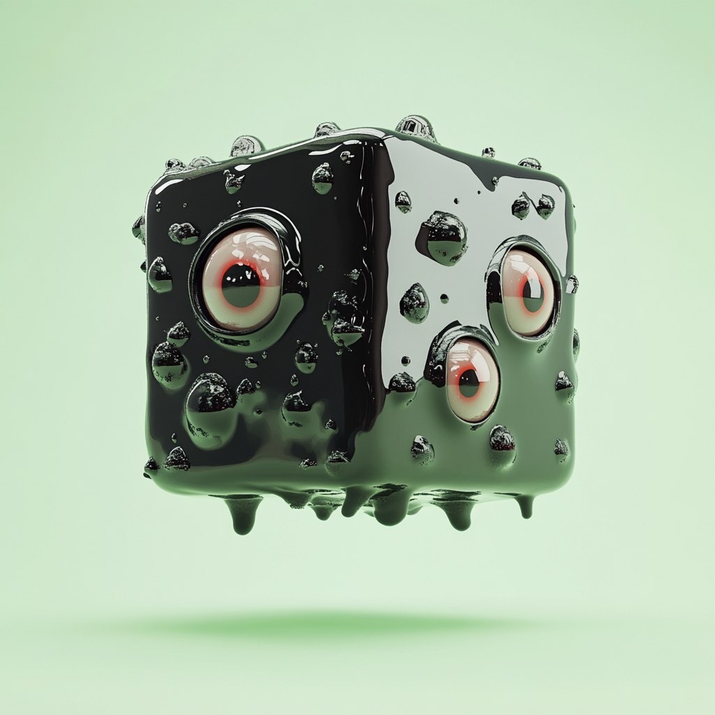 Создано на основе запроса: floating cube, green background, texture resembles black oil, shiny, very small eyes with red pupils spread in