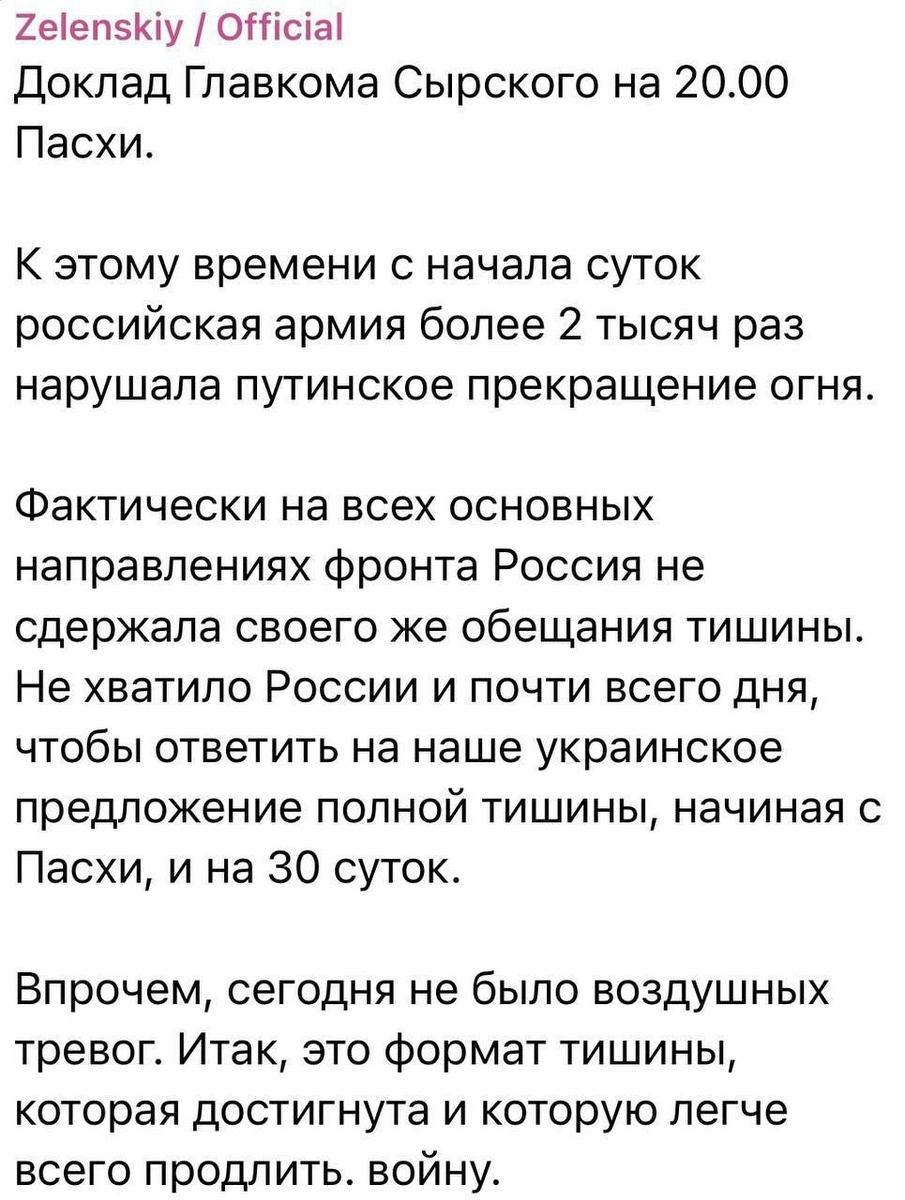 Зеленский выступил с новым заявлением по поводу перемирия: Сегодня не было тревог. Украина предлагает отказаться от каких-либо ударов дронами и ракетами по гражданской инфраструктуре на срок не менее 30 суток. Selenskyj gab eine neue Erklärung zum Waffenstillstand ab: Heute gab es keine Alarme. Die Ukraine schlägt vor, für einen Zeitraum von mindestens 30 Tagen auf jegliche Drohnen- und Raketenangriffe auf die zivile Infrastruktur zu verzichten.