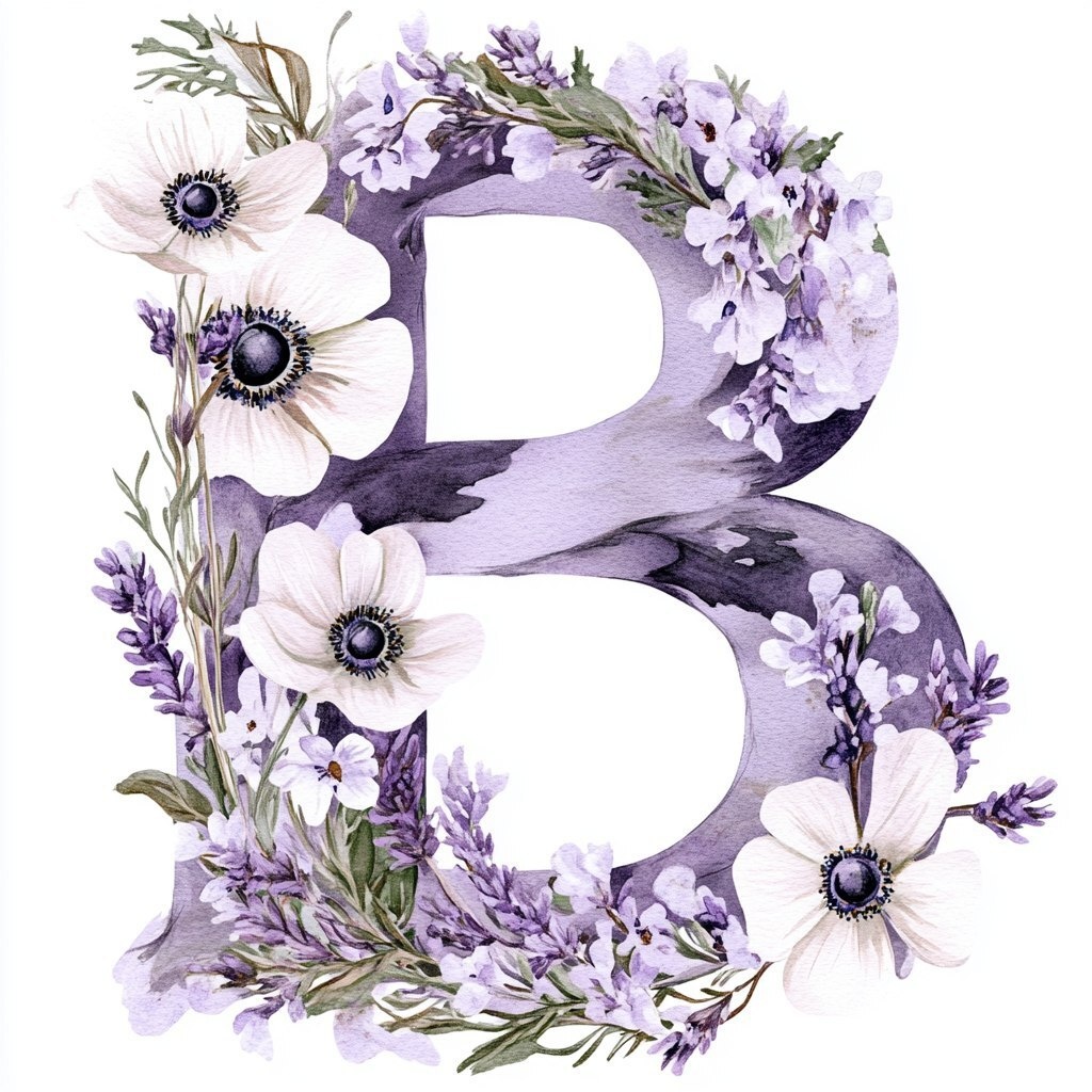 Создано на основе запроса: Floral letter B with lavender sprigs, white anemones, and soft greenery, hand-painted watercolor design, elegant