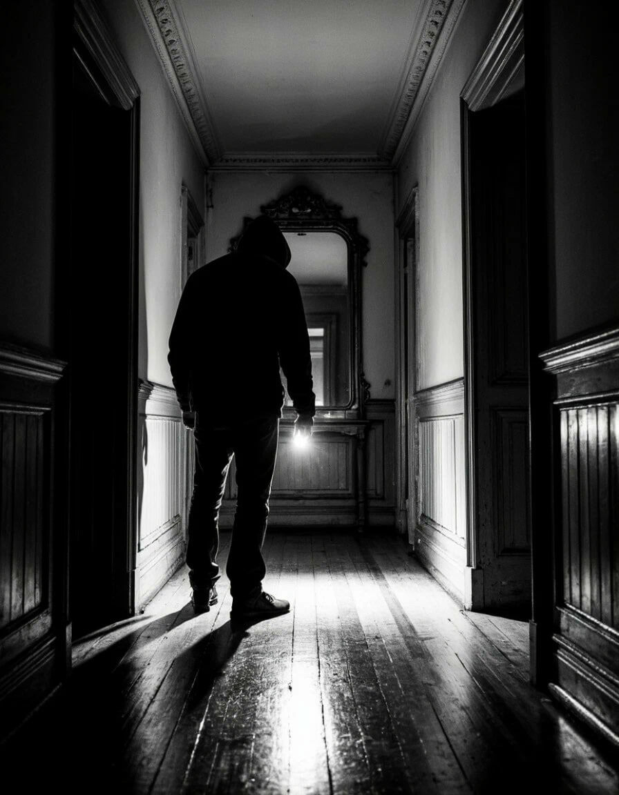 🪞 Он решил осмотреть первый этаж, оттягивая неизбежное. Фонарь выхватил узкий коридор, уходящий влево. Там, в полумраке, тускло блестело зеркало. (цитата из 2️⃣ главы) .