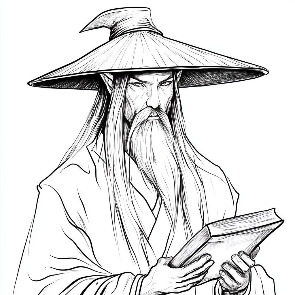 Создано на основе запроса: a black and white line drawing portrait of an thin elf wizard with a narrow Asian style beard