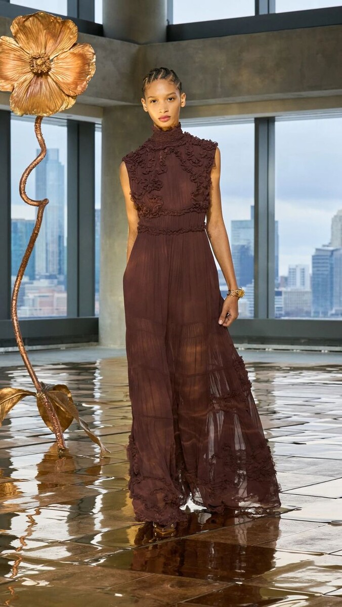 Натуральные ткани продолжают царствовать: лен, шелк, хлопок, шерсть. Но дизайнеры всё чаще выбирают миксы — например, хлопок с вискозой или шерсть с полиамидом, чтобы добиться нужной пластики. Особенно актуальны полупрозрачные ткани в вечерних моделях: они позволяют играть с многослойностью, придавая образу загадочность, но без излишней откровенности.