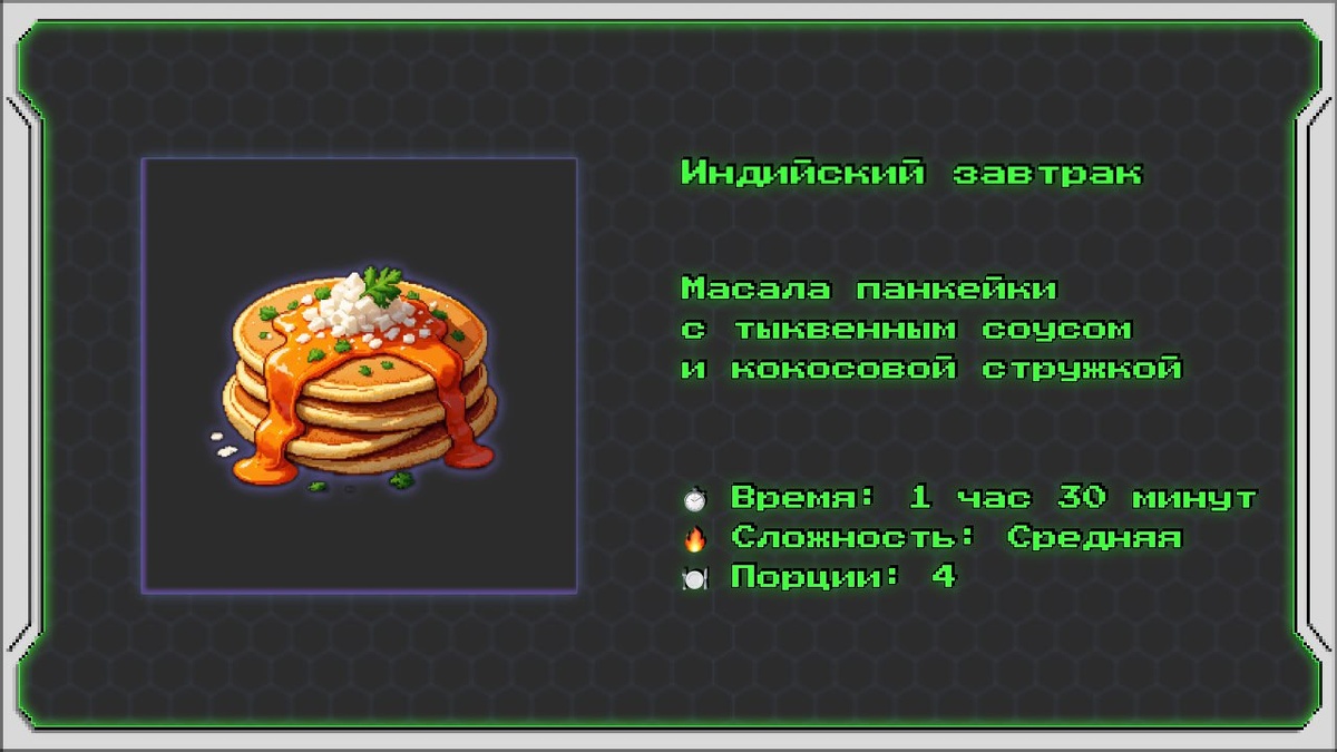 Индийский завтрак Масала панкейки с тыквенным соусом и кокосовой стружкой Этот рецепт представляет собой необычную интерпретацию традиционных индийских панкейков — доса, где тесто готовится с добавлением специй, а подача дополняется сладко-пряным тыквенным соусом и кокосовой стружкой. Это блюдо идеально подходит для сытного и необычного завтрака, отражающего богатство индийской кухни. Информация о рецепте: ⏱️ Время: 1 час 30 минут 🔥 Сложность: Средняя 🍽 Порции: 4 Ингредиенты: Для панкейков: • 🍚 Рисовая мука — 200 г • 🌿 Чечевица (мунг дал, замоченная на 30 минут) — 100 г • 💧 Вода — 300 мл • 🌶 Куркума молотая — ½ чайной ложки • 🌿 Кориандр молотый — 1 чайная ложка • 🌶 Паприка молотая — ½ чайной ложки • 🫒 Оливковое масло — 2 столовые ложки • 🧂 Соль — по вкусу Для тыквенного соуса: • 🍂 Тыква (нарезанная мелкими кубиками) — 200 г • 🍯 Мёд — 1 столовая ложка • 🌿 Имбирь (натёртый) — 1 чайная ложка • 🌶 Кардамон молотый — щепотка • 🫒 Оливковое масло — 1 столовая ложка Для