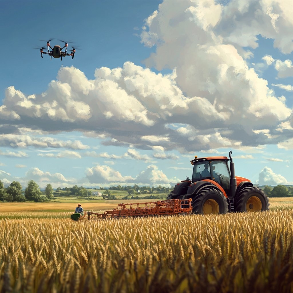 Создано на основе запроса: hyper-realistic, Pixar Style, wheat field with a drone flying over, a tractor with an African American farmer plows through the field.