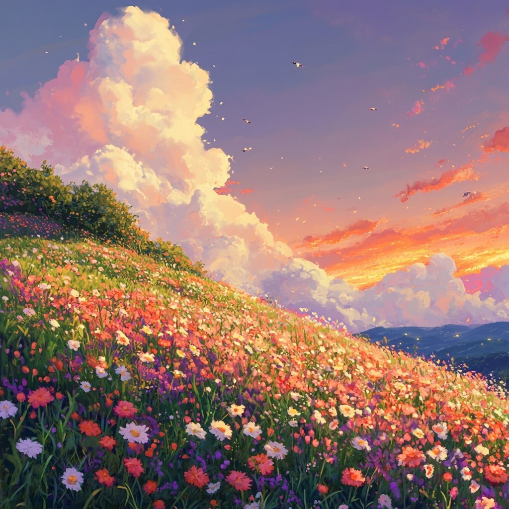 Создано на основе запроса: A beautiful background artwork that is a feild of flowers with a perfect hill to sit on, beautiful and there are