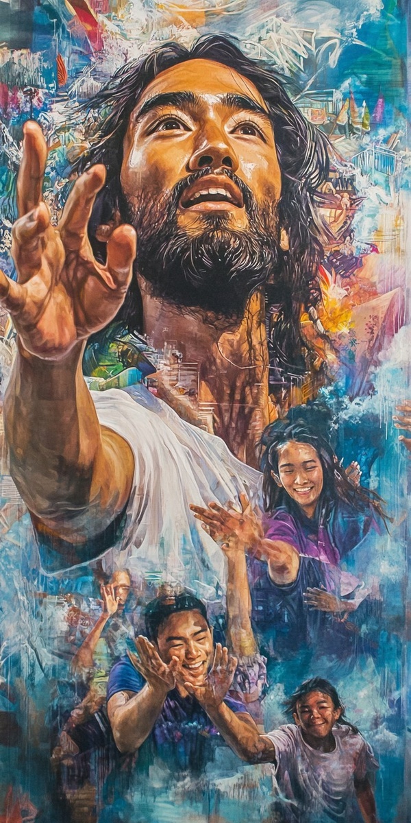Создано на основе запроса: photorealistic mural-style art featuring Christ uplifting Pacific Islander college students