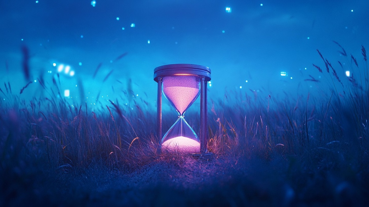 Создано на основе запроса: A retro cinematic wide shot of a glowing hourglass lying partially buried in the middle of an open blue-toned field at night. The sand inside the hourglass is frozen mid-fall, glowing softly in violet light, surrounded by tall swaying grass and drifting blue mist. Faint neon reflections shimmer across the glass surface. The sky above is vast and dreamy, filled with scattered stars and subtle glowing symbols, evoking memories and the quiet passage of time. VHS tape texture, heavy film grain, romantic and surreal atmosphere, 1980s-inspired visual tone --- Автоперевод: Ретро-кинематографический снимк светящихся песочных часов, частично похороненных посреди открытого синего поля ночью. Красиво выглядит? 🤔 https://dzen.ru/id/65c0c65c86e4f837c27b24d7 #ИИ #AI #нейросеть #midjourney #art