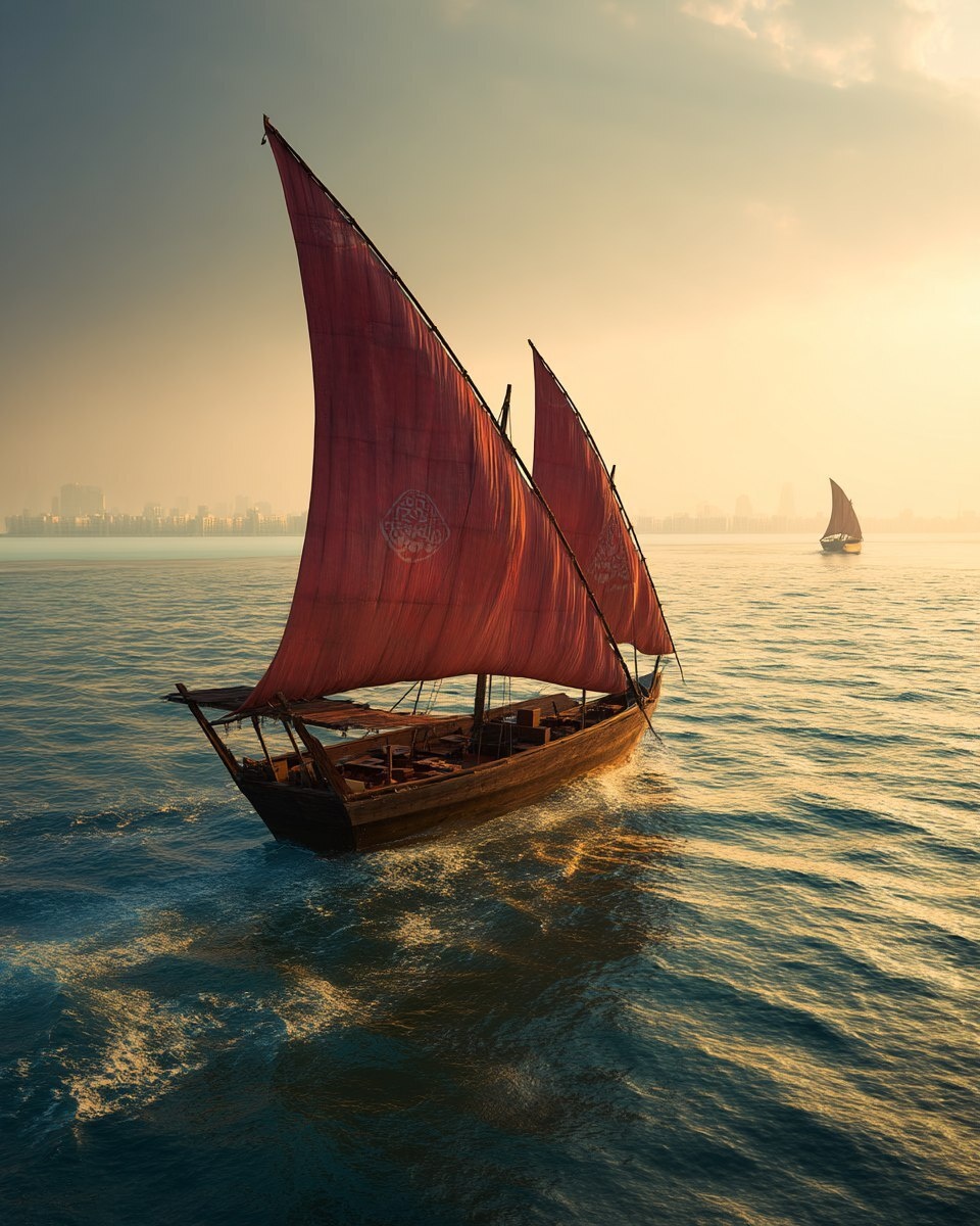 Создано на основе запроса: Photorealistic traditional wooden dhow ship with Red Sea Coast Coffee sacks onboard, sailing across the Red Sea during a golden hour sunset, dramatic lighting, distant coastal Yemeni port in background, sails with subtle logo pattern, epic and cinematic atmosphere --- Автоперевод: Фотореалистическое традиционное деревянное судно с кофейными мешками на побережье Красного моря на борту, плавая через красное море во время заката Золотого часа, драматическое освещение, далекий прибрежный йеменский порт, на фоне, паруса с тонким схем логотипа, эпическая и кинематографическая атмосфера Неплохо вышло? 🤔 https://dzen.ru/id/65c0c65c86e4f837c27b24d7 #ИИ #AI #нейросеть #midjourney #art