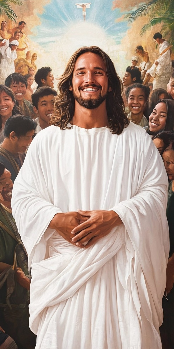 Создано на основе запроса: photorealistic wall art featuring a smiling, white-robe-wearing Christ prominently with a background montage of
