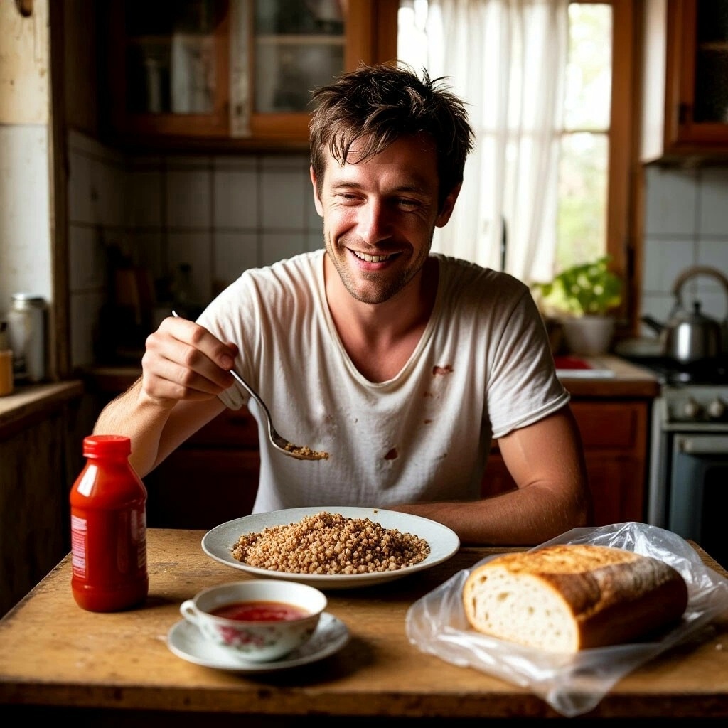 И всё. Сидим вдвоём. Едим гречку. Она ревет в котлету, я — в майке и носках. И тишина такая… снова тишина. Только уже другая.