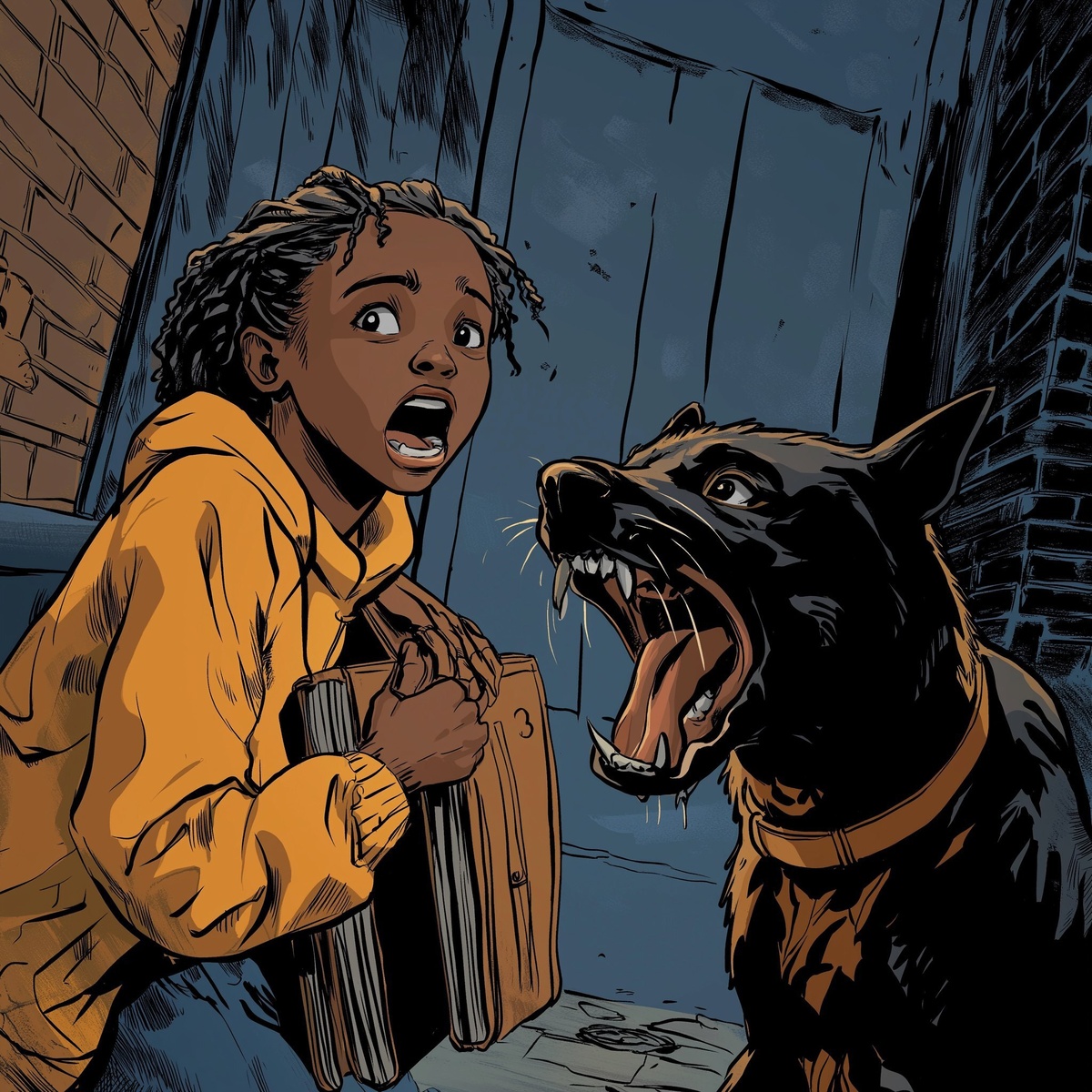 Создано на основе запроса: in an illustrated comic book style, a young black girl cornered in a dark alley by a barking aggressive dog