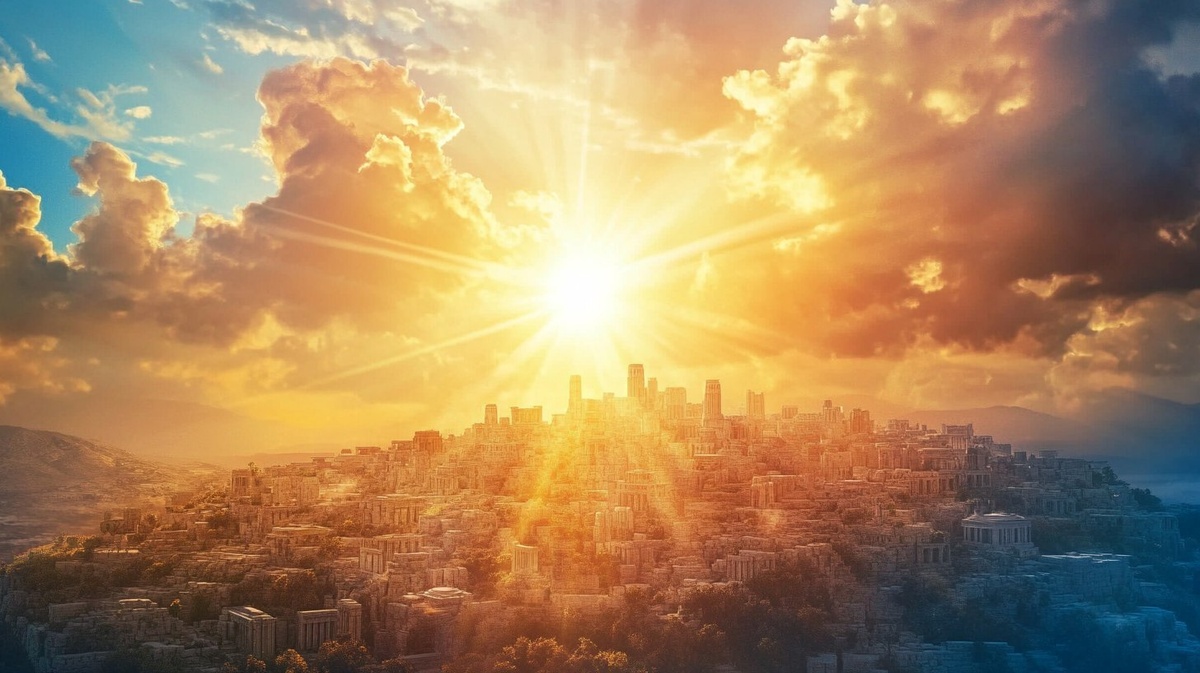 Создано на основе запроса: Lemuria, stone solid buildings, sun rays, peaceful and mystical city in a landscape view, high-tech