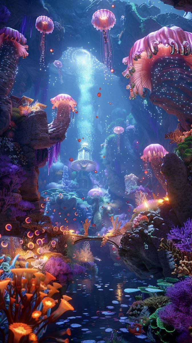 Создано на основе запроса: an ancient underwater temple surrounded by glowing coral and swimming jellyfish, light filtering from the