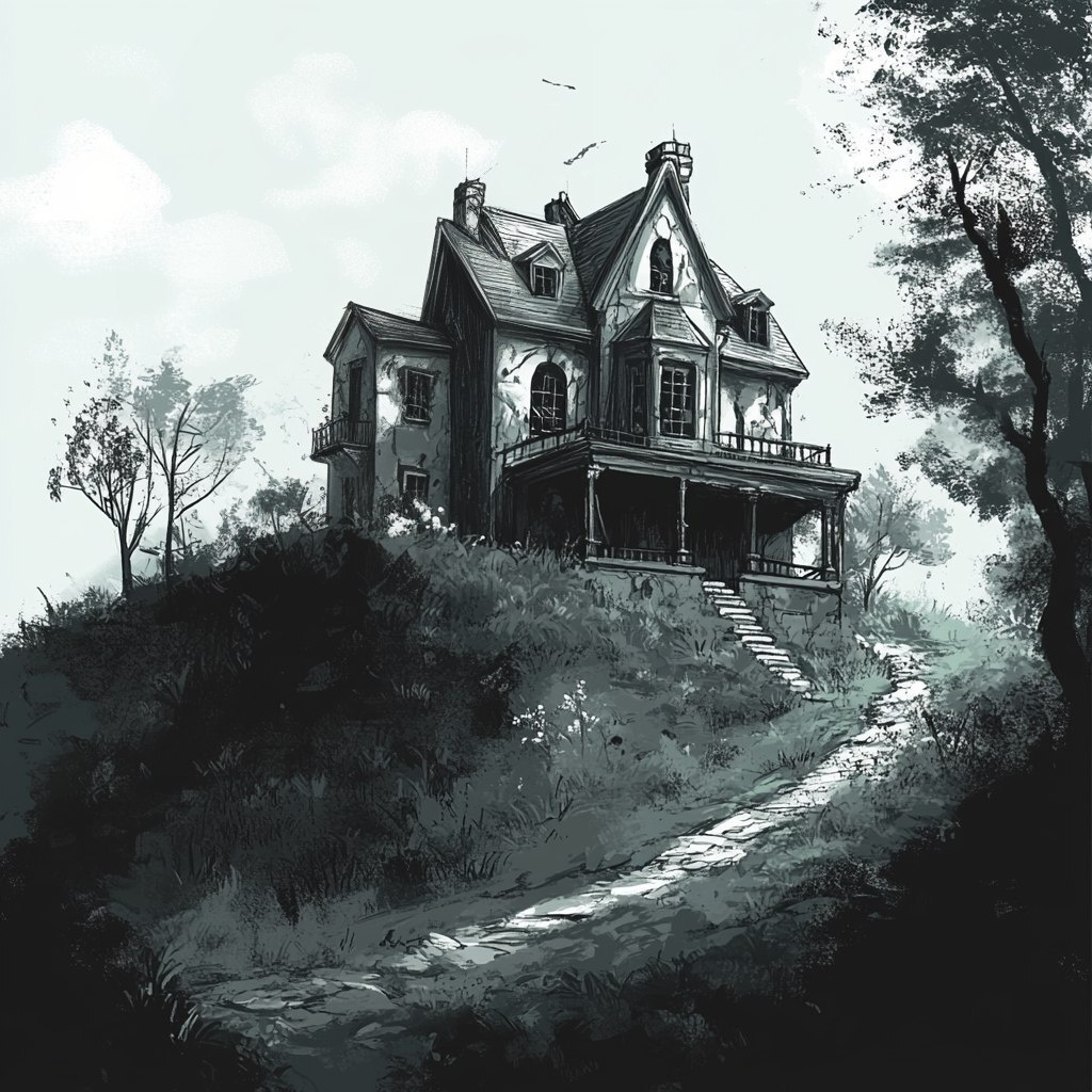Создано на основе запроса: abandoned ruined mansion on leafy wooded forest steep hilltop scribble style sketch