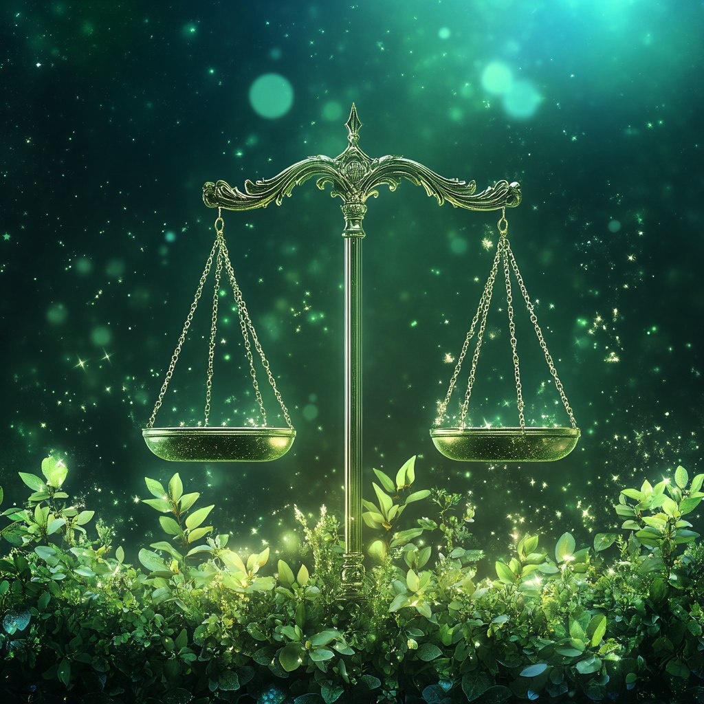 Создано на основе запроса: A realistic 16:9 image of the zodiac sign scale and green background inspired by Nature